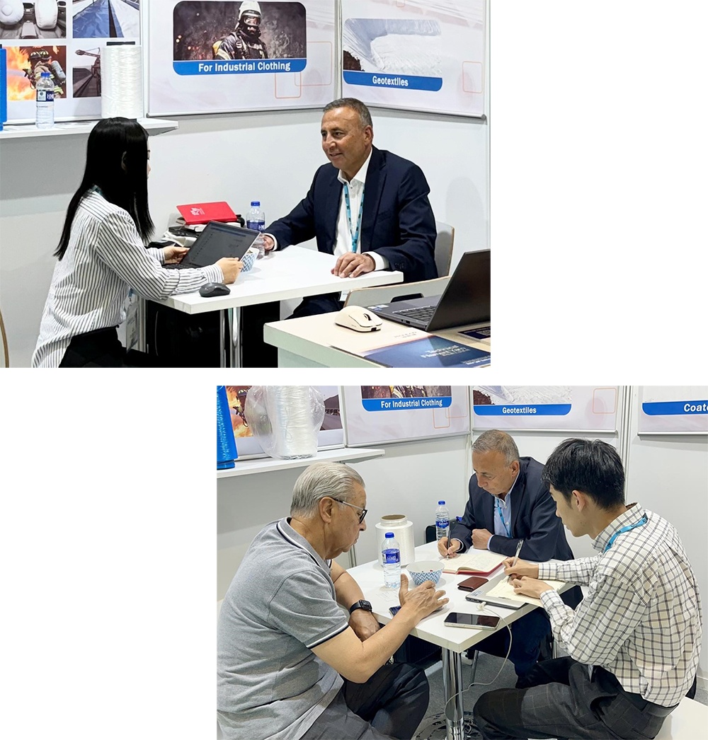 公司携抗芯吸、尼龙、缝纫线、PPS等系列差异化产品参展,吸引了来自土耳其、德国、意大利等国家的新老客商驻足观看。其中,低收缩产品因其广泛应用于胶管、篷布、膜材料等领域,迎合了土耳其市场需求,备受青睐。而抗芯吸产品能够解决由于“灯芯效应”造成的产业用布吸湿吸水问题,展现出强大的市场潜力,成为本次展会的主推产品之一。
